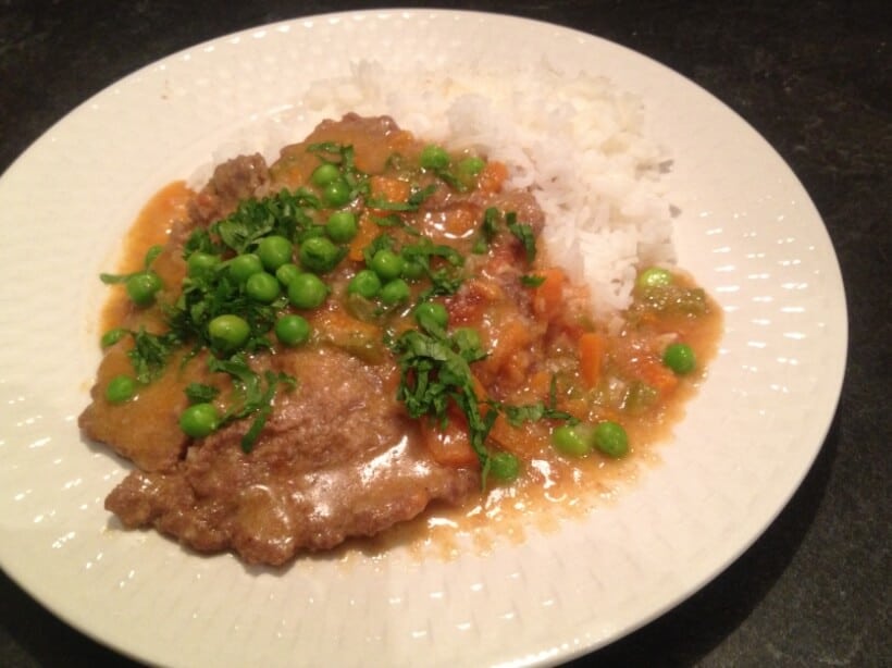 - Dejar cocer un par de minutos y luego agregar las presas de pollo, las arvejas y papas, después de unos 5 minutos más de cocción, servir.